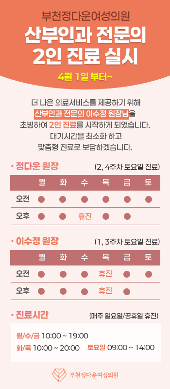 (04/01~) 2인 진료 안내 페이지 정보 작성자 관리자 작성일25-03-06 10:28 조회490회 댓글0건 관련링크 본문 25년 04월부터 더 나은 의료서비스를 제공하기 위하여이수정 원장님을 초빙하여 2인 진료를 실시합니다. 대기시간을 최소화하고 맞춤형 진료로 보답하겠습니다. 감사합니다. 목록보기