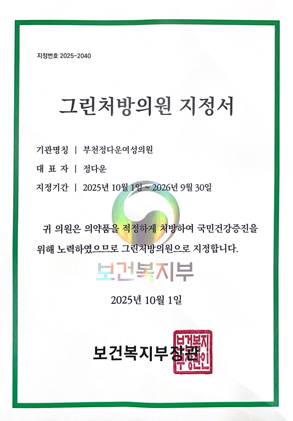 본원은 2025년 10월 1일 보건복지부에서 지정하는 그린처방의원에 지정되었습니다.